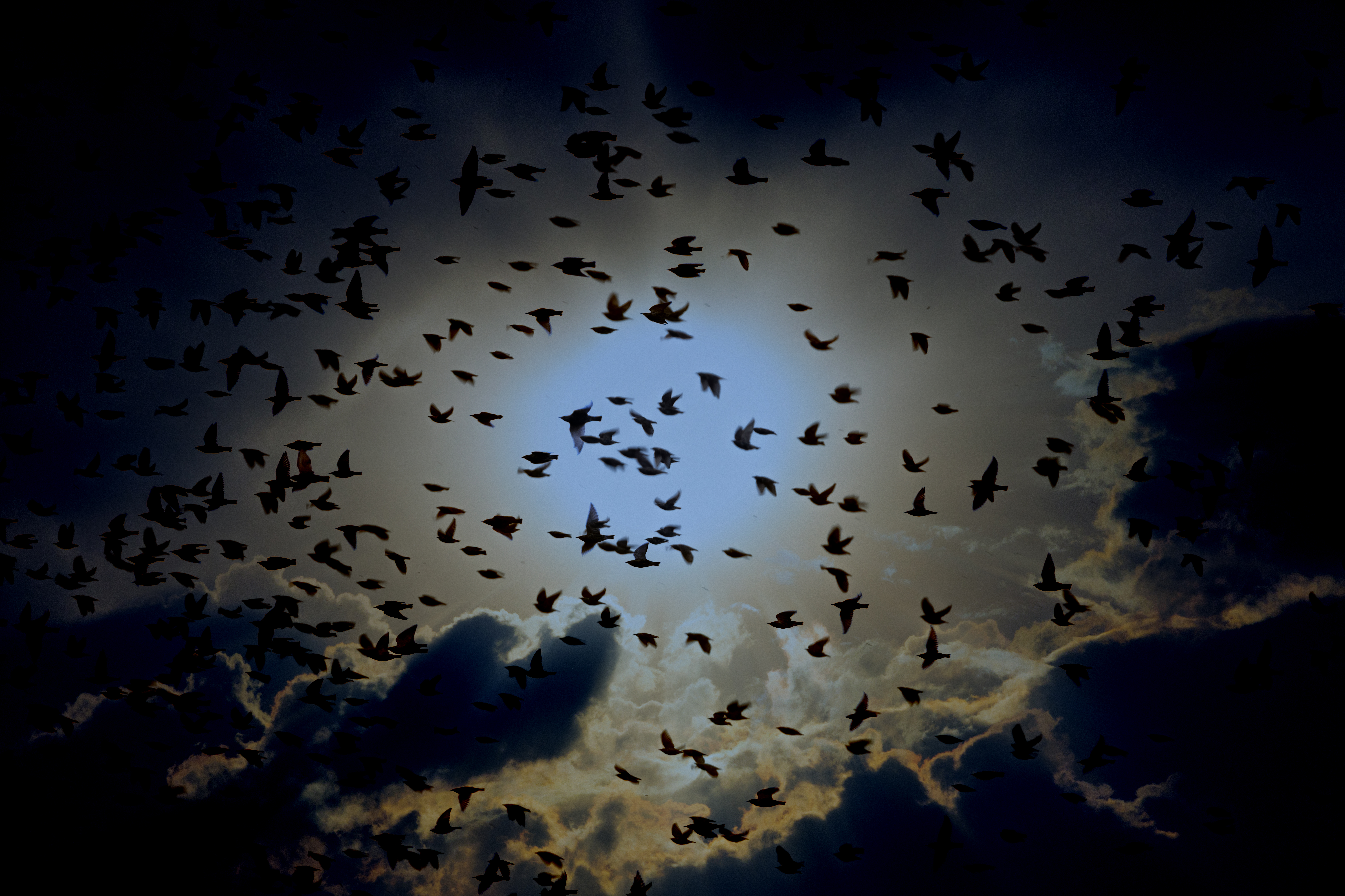 A blurred flock of flying birds against sky