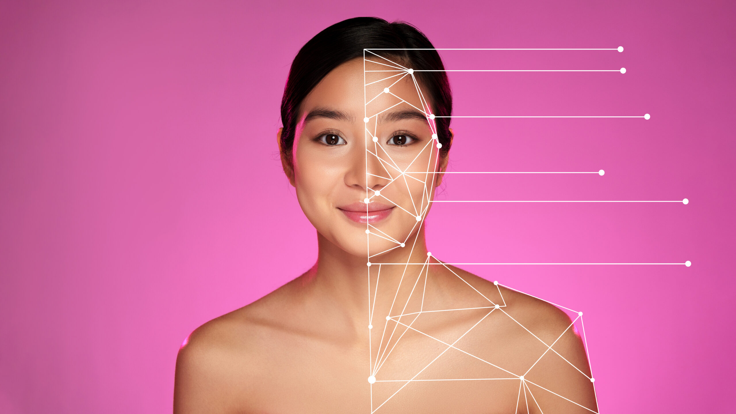 Sophisticated digital art showcasing facial features against a vibrant pink background during a creative tech exhibit