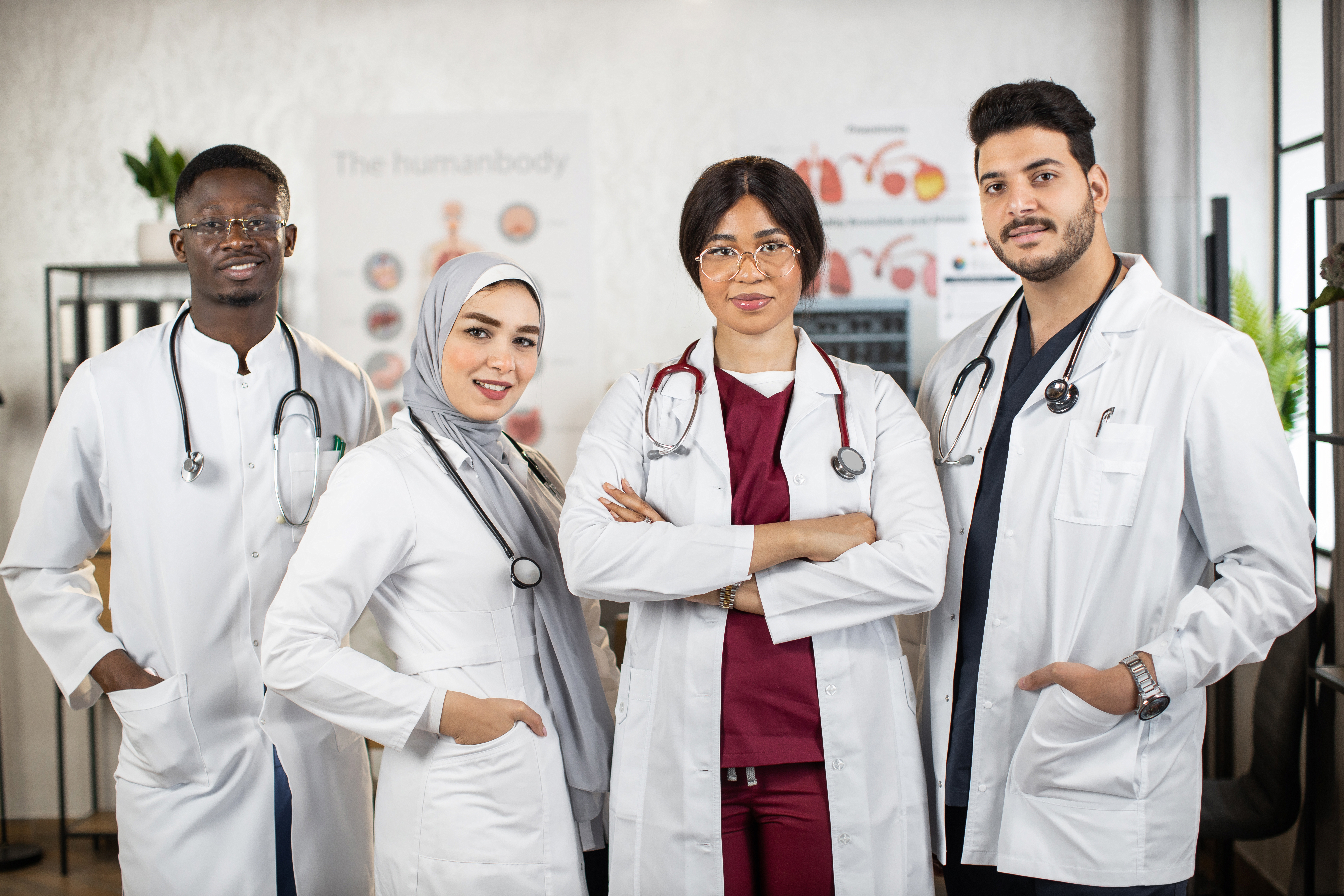Team of four female and male multiracial doctors posing indoors