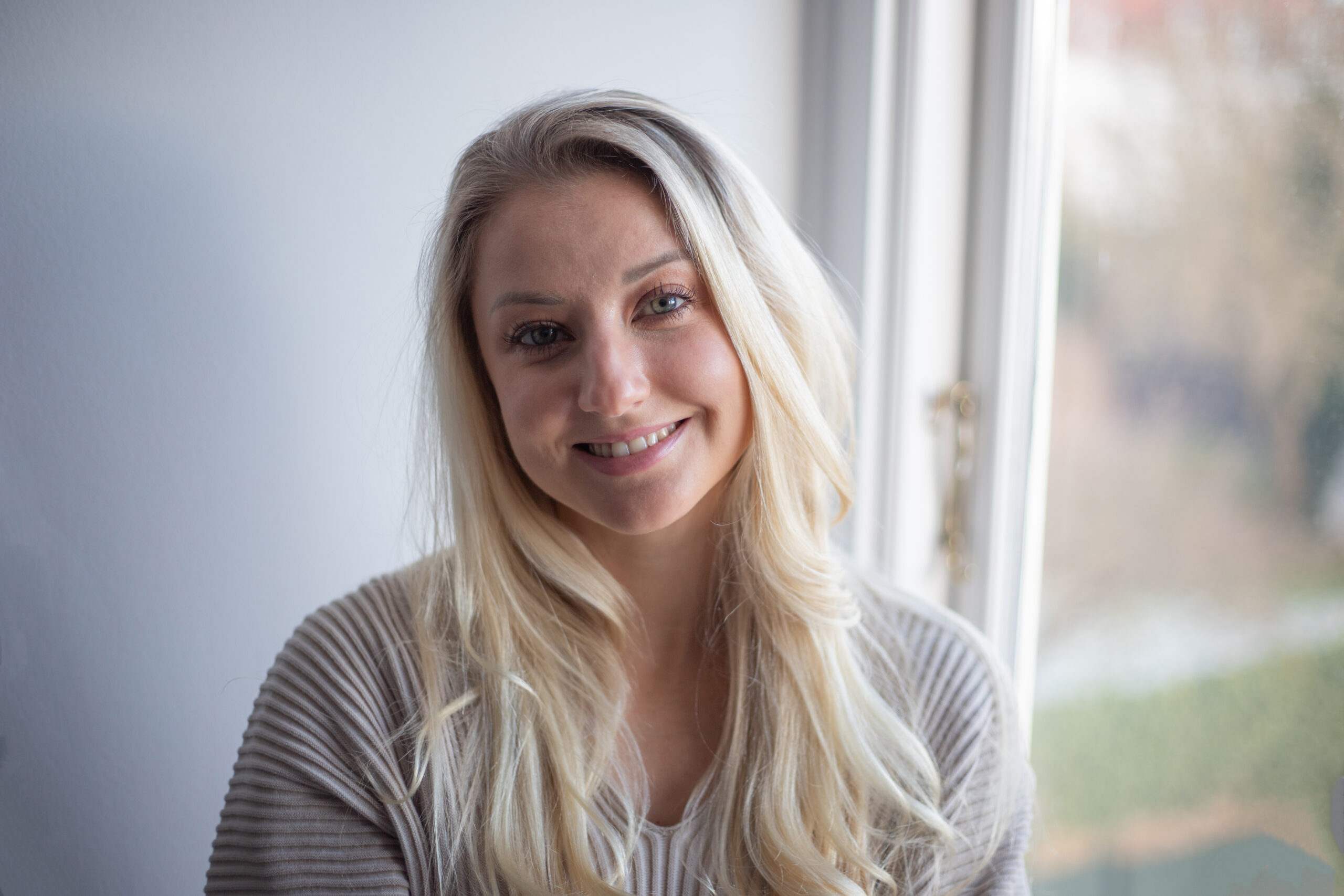 Portrait of a smiling blond girl, attractive happy caucasian woman