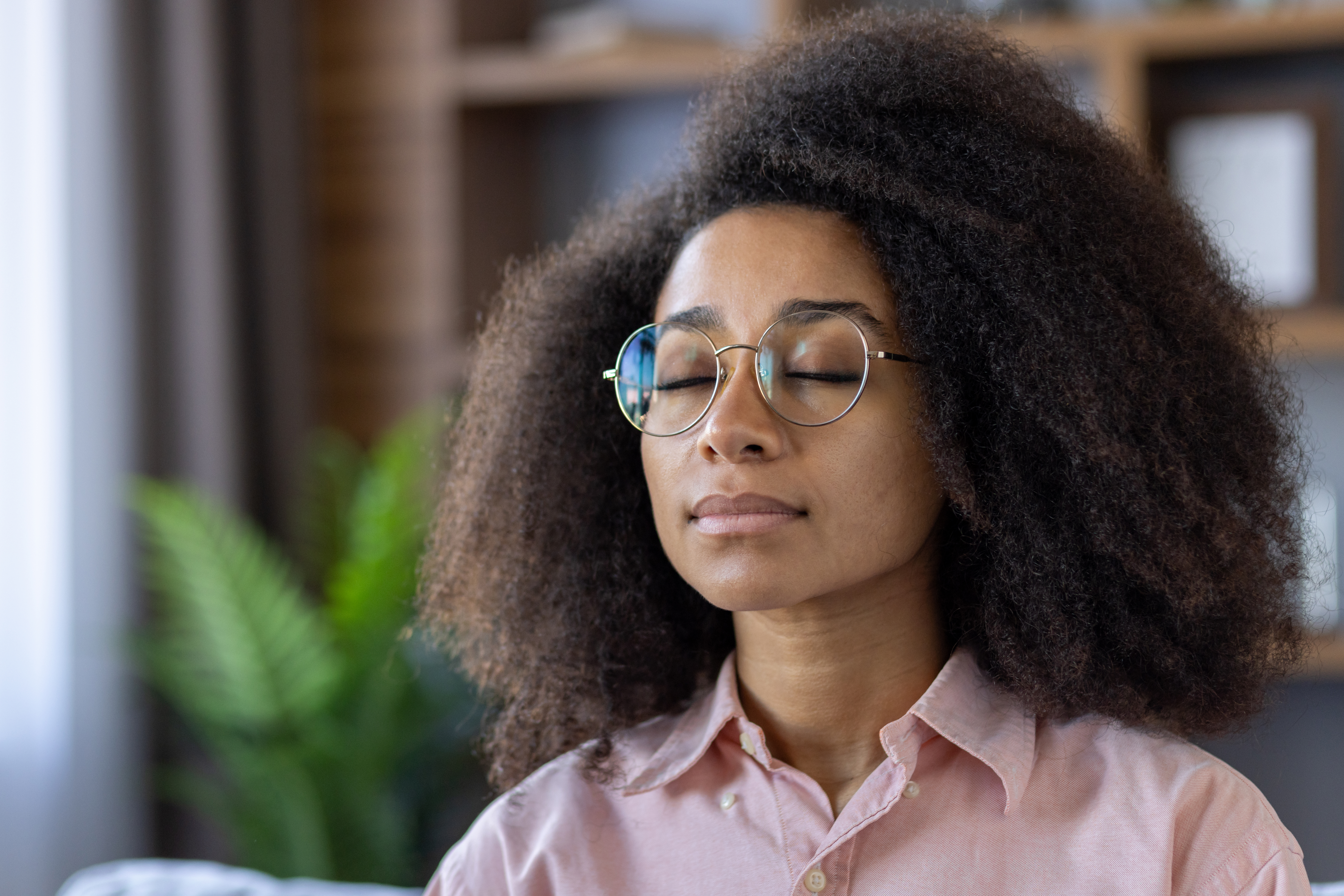 Woman with curly hair meditating indoors with eyes closed in a warm, peaceful home environment