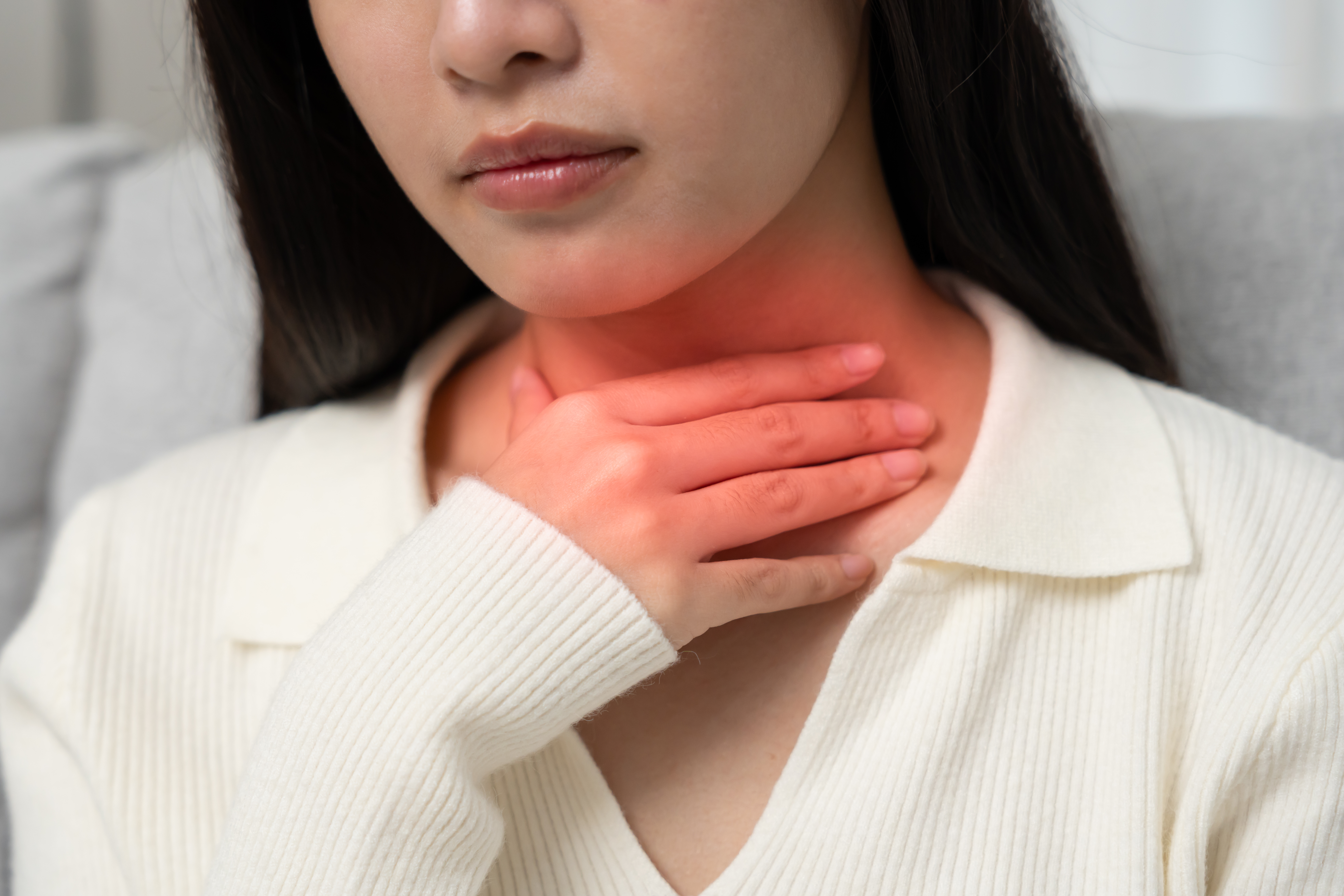 Close up of young Asian woman rubbing her inflamed tonsils, tonsilitis problem, cropped. Woman with thyroid gland problem, touching her neck, girl has a sore throat