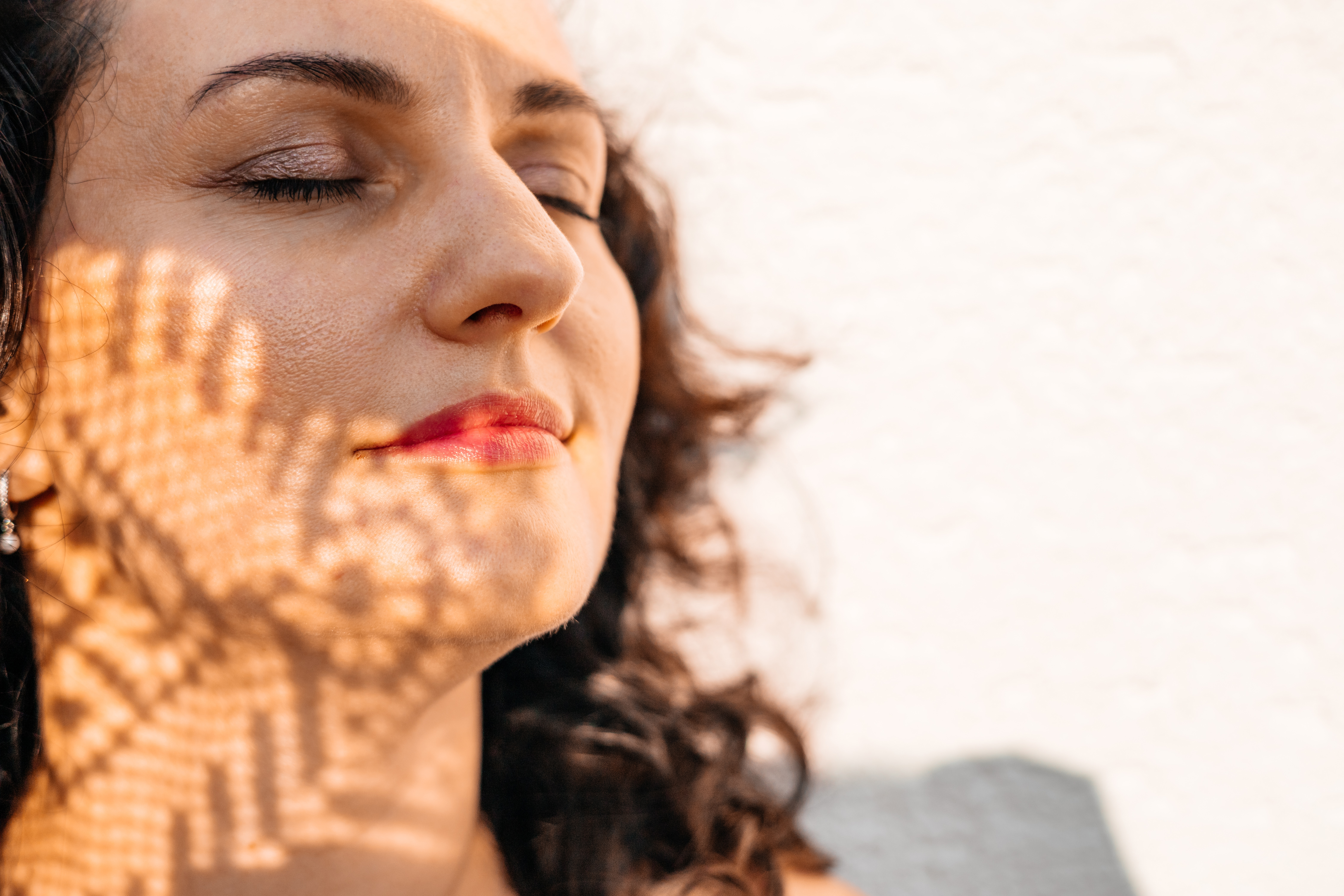 Woman with closed eyes, leaf shadow on face, enjoying sunlight, peaceful and relaxed moment