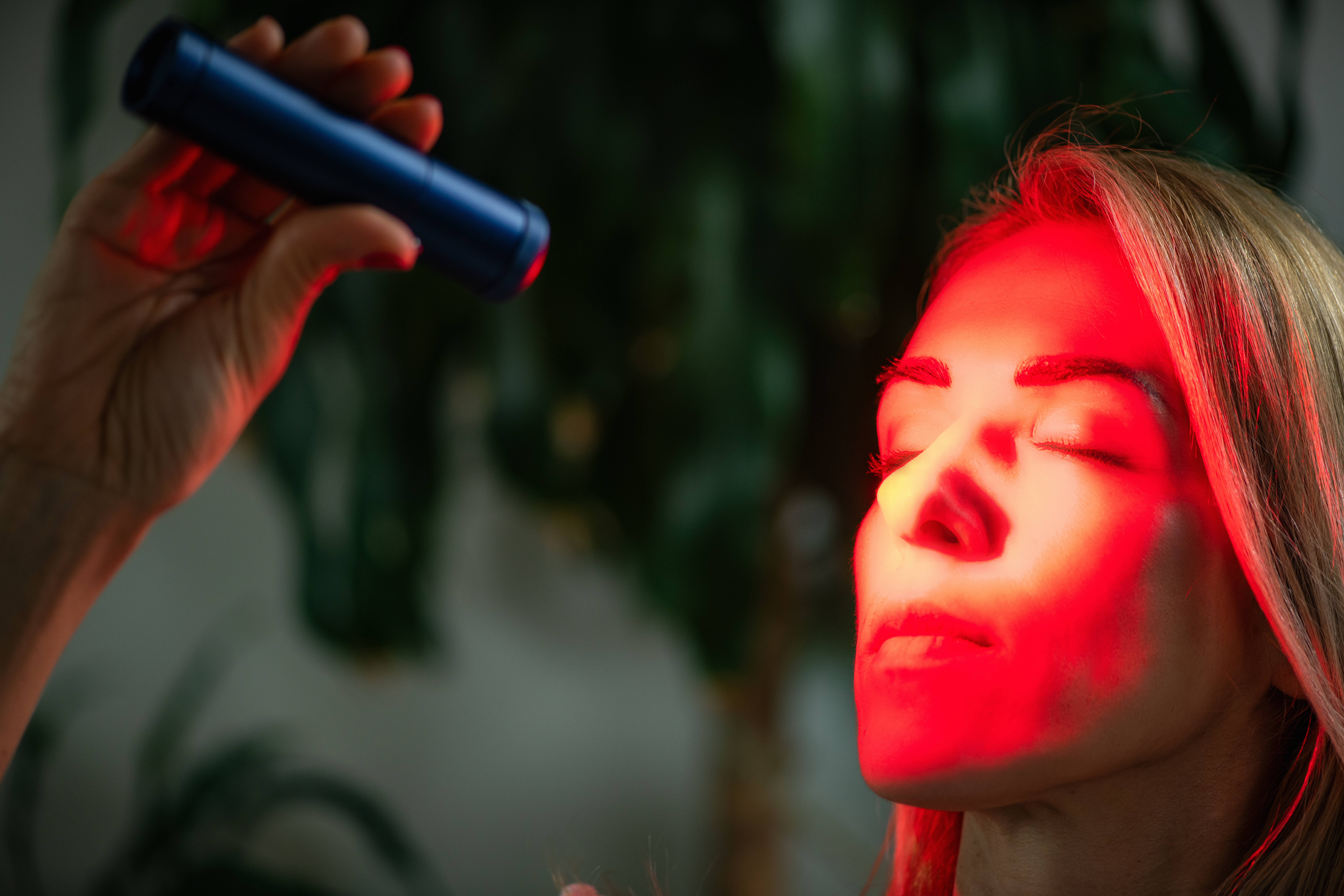Woman using a red light therapy known for boosting collagen, reducing wrinkles, and improving skin tone through LED light technology in a skincare routine.