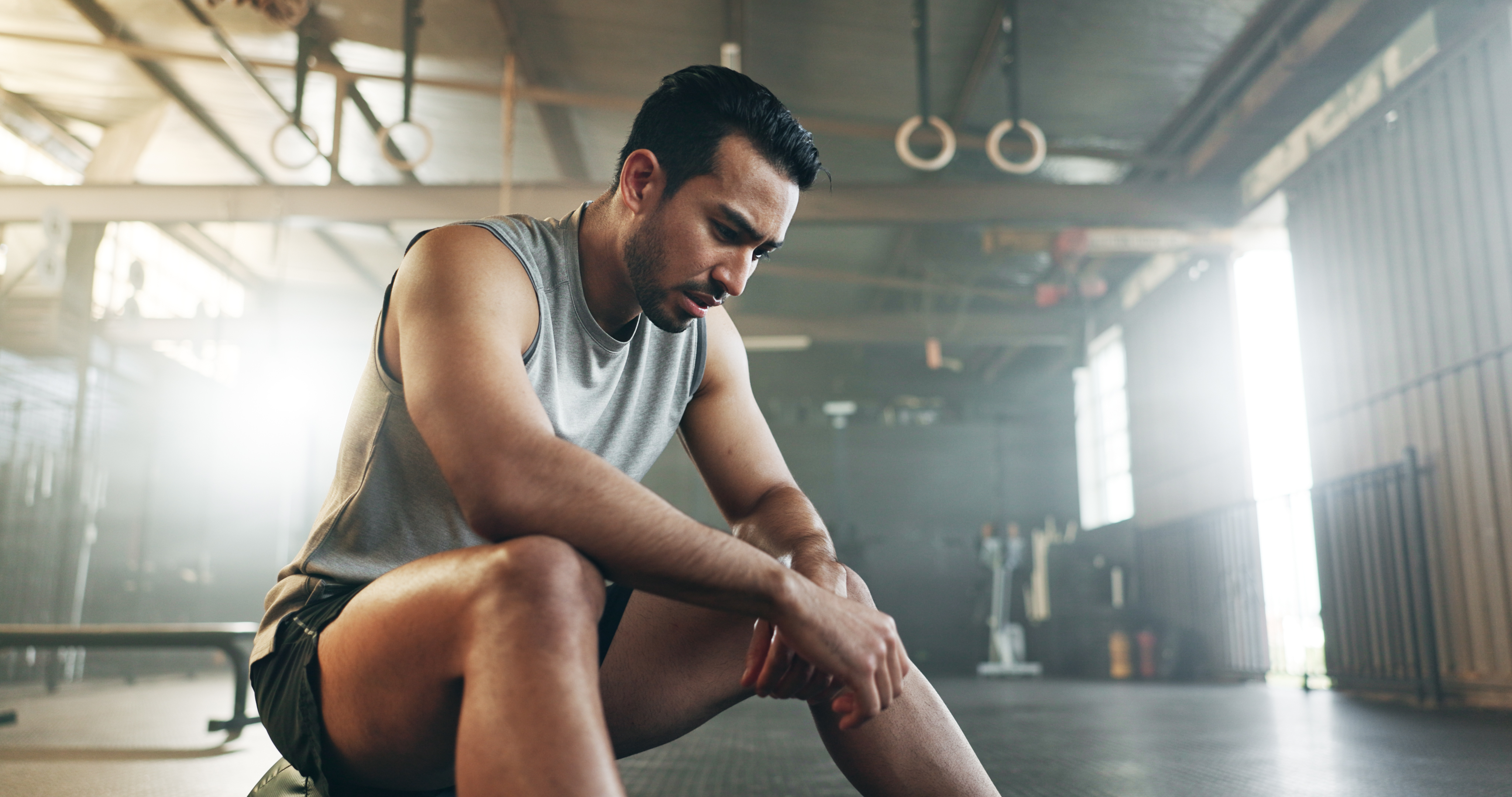 Fitness, breathing and sweating with a tired man in the gym, resting after an intense workout. Exercise, health and fatigue with a young athlete in recovery from training for sports or wellness