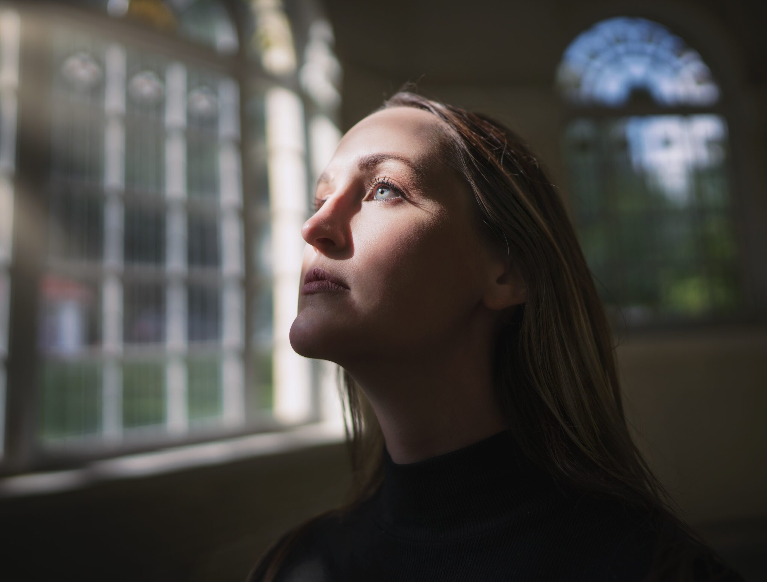caucasian woman looking through window with face illuminated